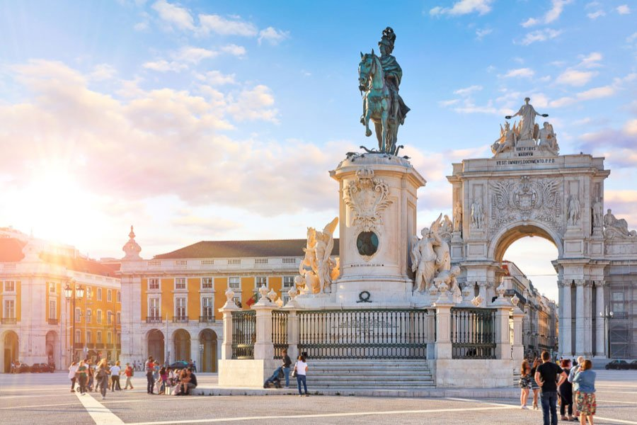 Главная набережная площадь с жёлтыми аркадами и видом на Tejo. Особенно красива на закате. Здесь же Arco da Rua Augusta.